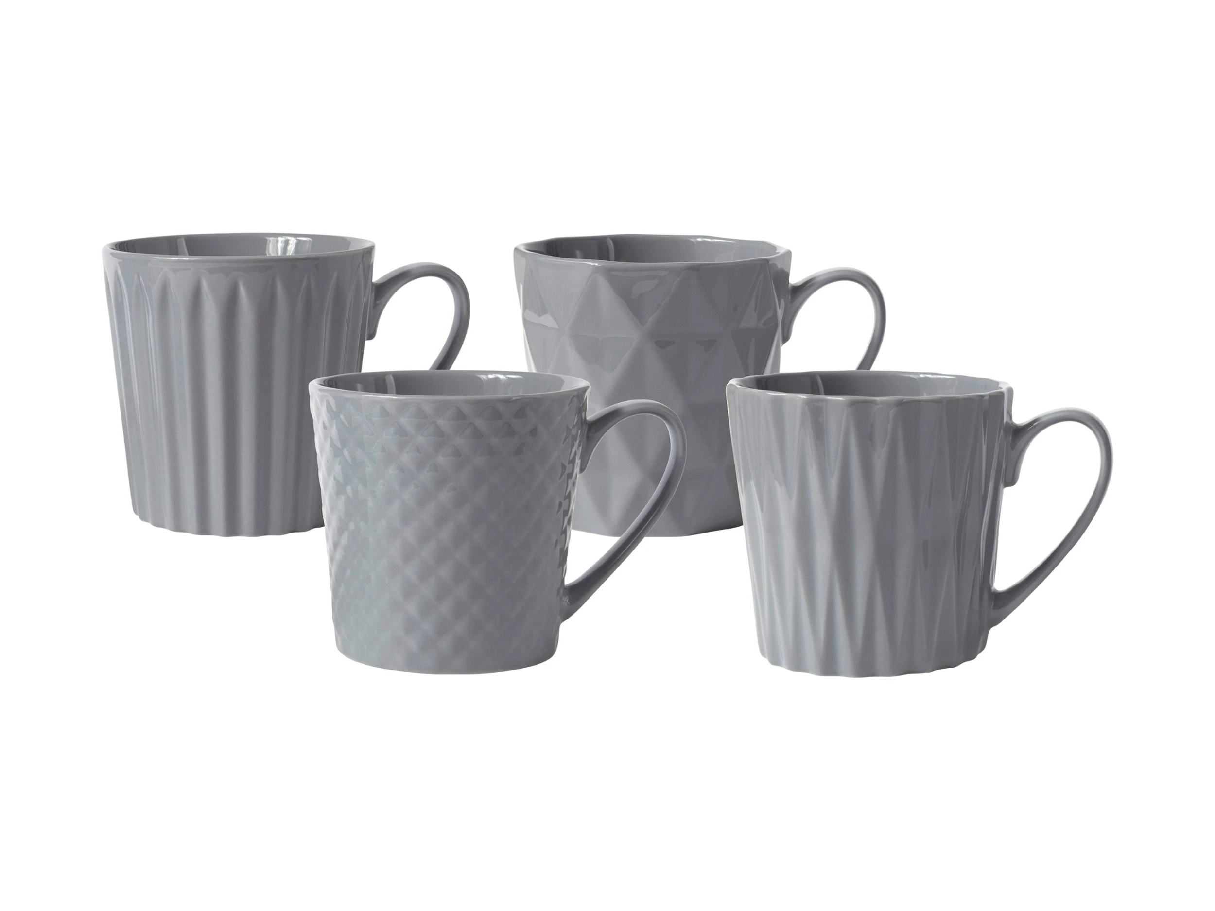 These grey Nova mugs will bring a touch of glamour to your kitchen. Finished with a shimmering pearlescent glaze, these striking mugs have a dramatic, contemporary look and will add a pop of colour to your coffee break. Made from quality porcelain, each set includes four different embossed and debossed geometric designs. Stylish and beautifully designed, they also make a delightful gift idea.